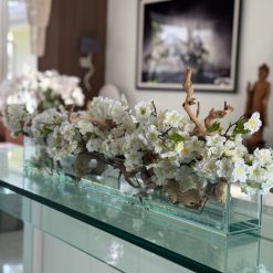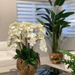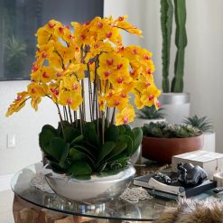 Delaney Gold Pot with Multiple Stems of Phalaenopsis Orchids and Succulents