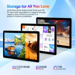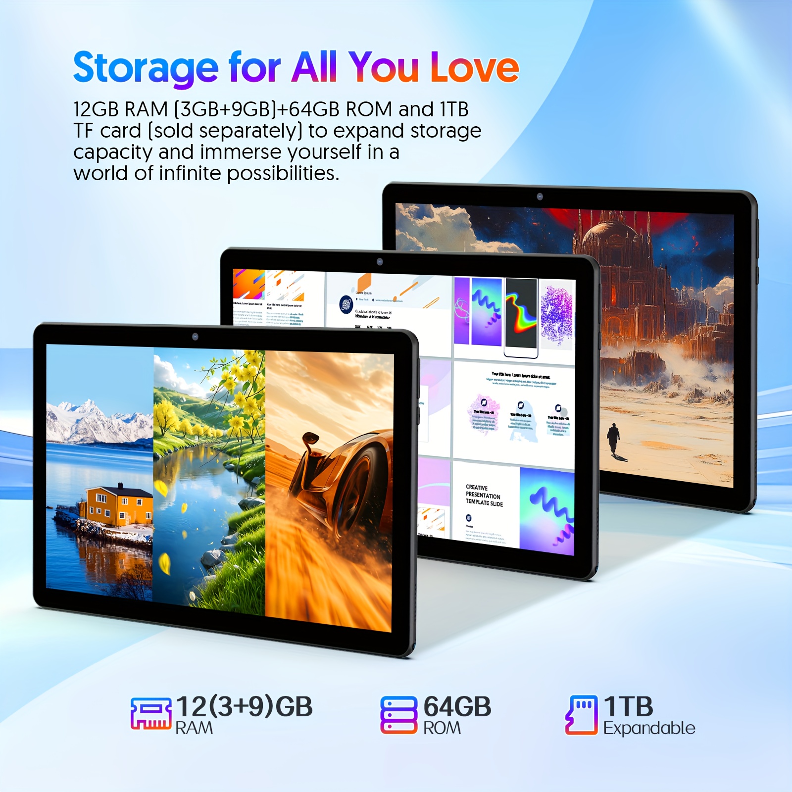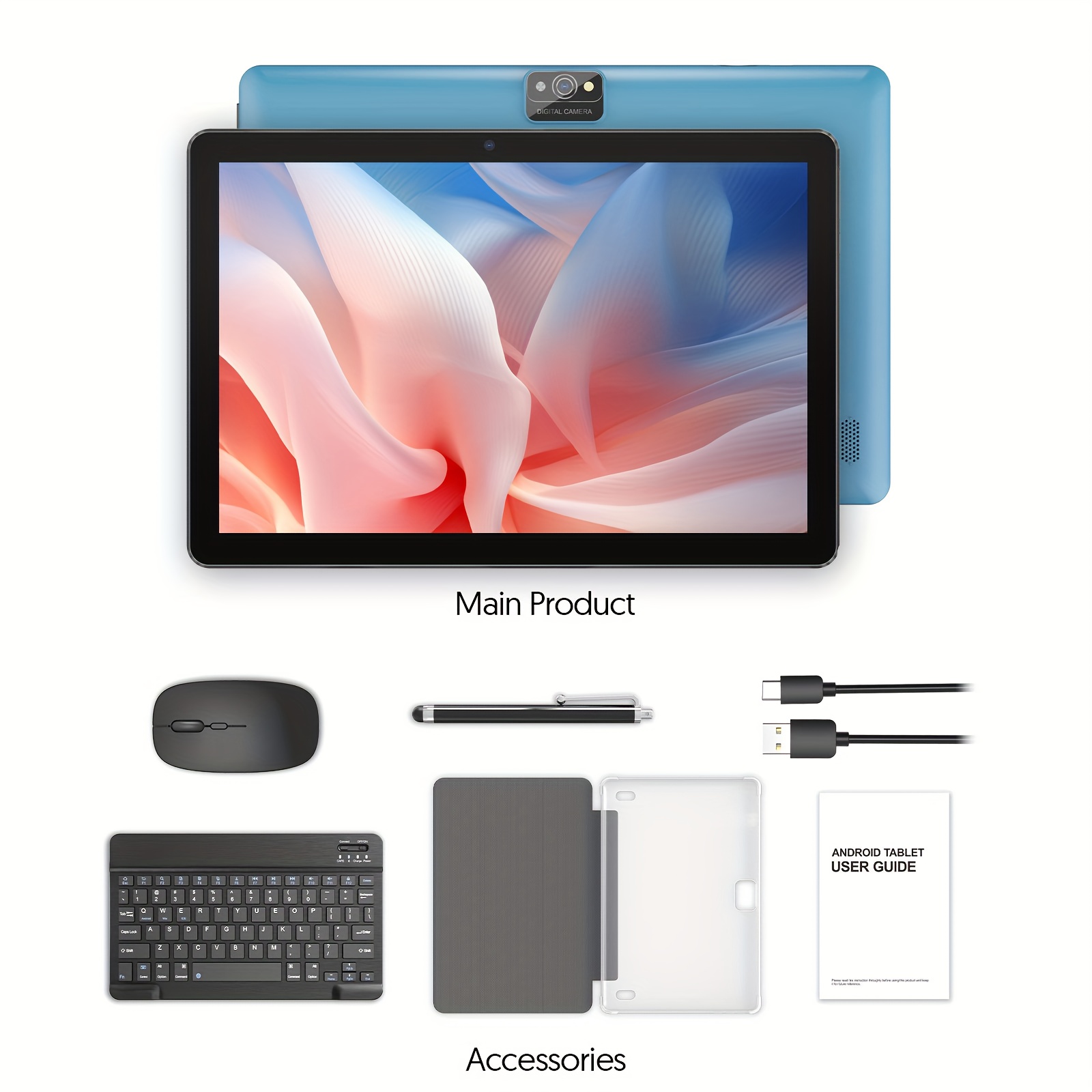 A 10-inch Android tablet with a 15-inch screen, 12 (3+9)GB RAM, 64GB ROM + 1TB expandable memory, 1280*800 IPS, 2.0MP + 8.0MP cameras, 6000mAh battery, system upgrade, tablet with keyboard, mouse, stylus, and protective case, high productivity, tech
