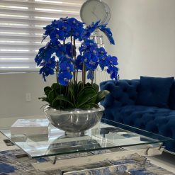 Graceful and exotic. the phalaenopsis orchid has symbolized integrity. nobility. and luxury for centuries. Our enduring. blue phalaenopsis arrangement captures the artistry and spirit of natural orchids. It’s prized for its profusion of perfect blooms. Vertical bamboo stakes. broad green leaves. and a genuine moss base add to the realism of this arrangement. Often called the “moth orchid.” the phalaenopsis is a favorite among our designers for its dense leaves. elegantly arching sprays and lovely blooms. Our remarkably lifelike arrangement is staked into a moss-covered silver avenue bowl for a timeless. authentic look that will endure for years to come. This arrangement is just the right size and is versatile enough to use as a coffee table centerpiece. a dining room or console table. It has a luscious tropical feel that will add vibrancy and elegance to any room.