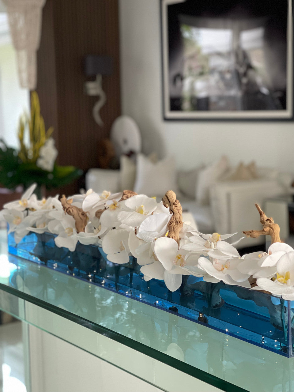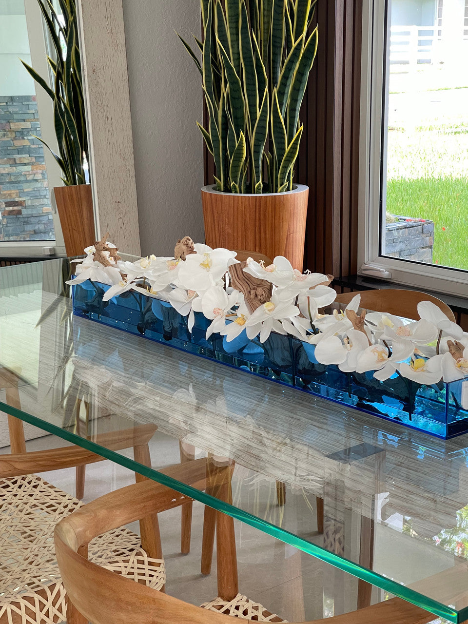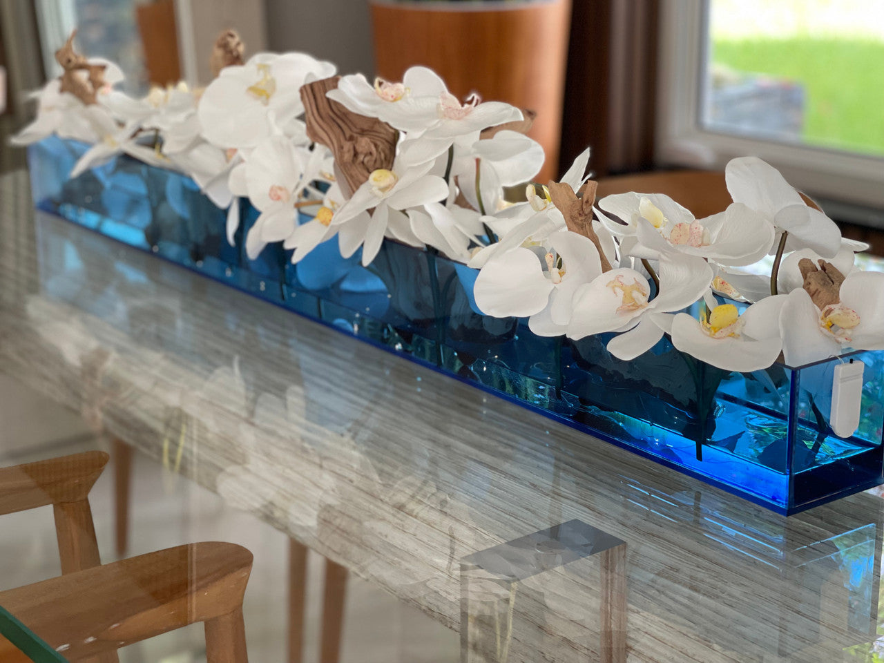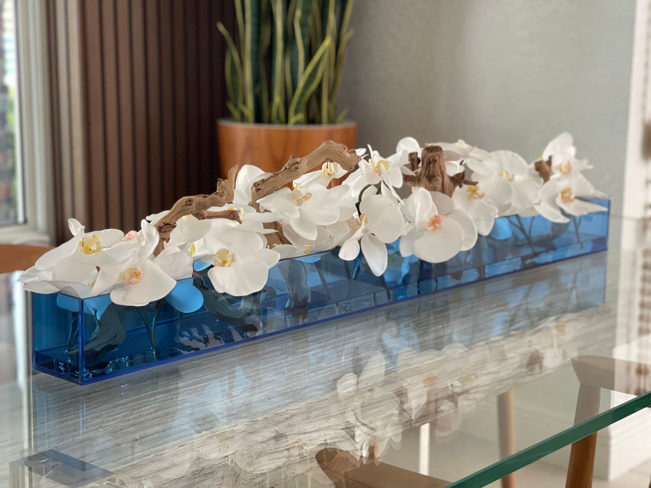 36″ Casa Moderna Blue Acrylic Planter with White Orchids and Driftwood