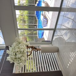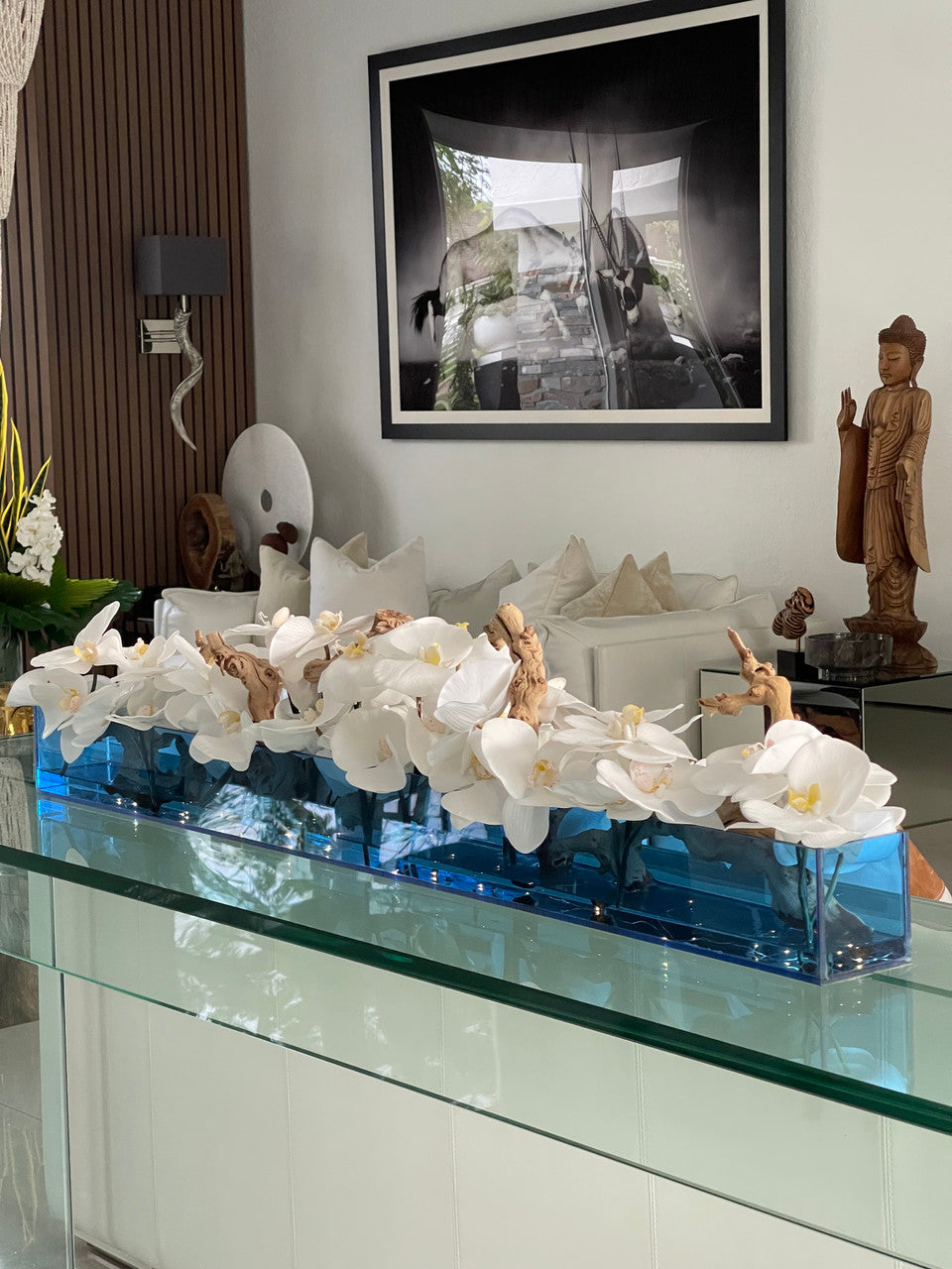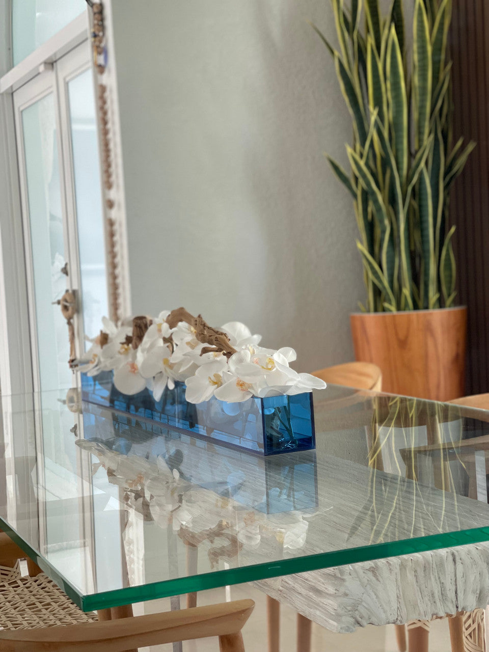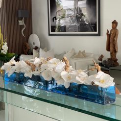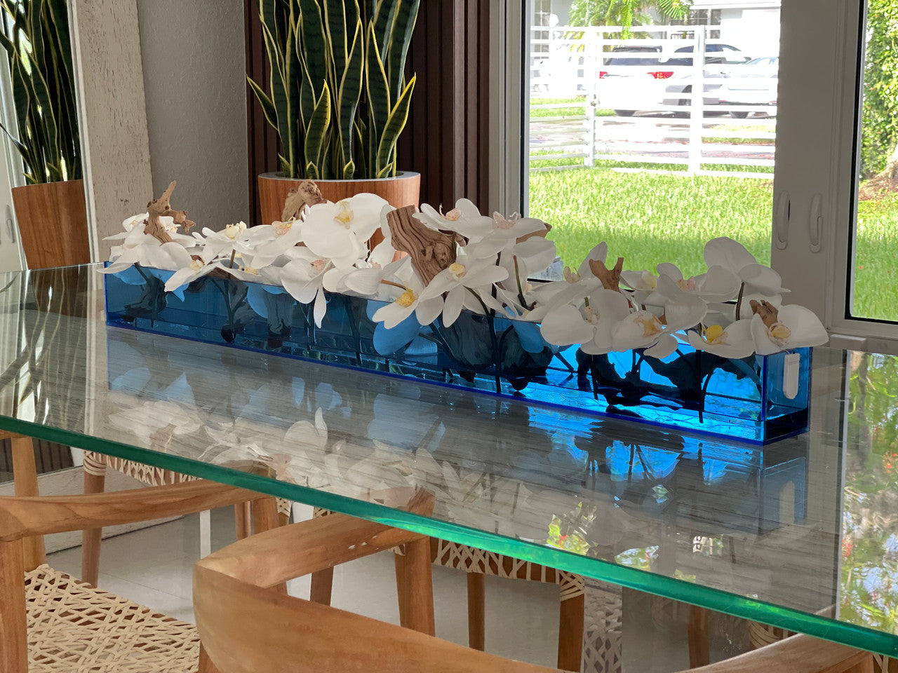 36″ Casa Moderna Blue Acrylic Planter with White Orchids and Driftwood