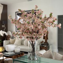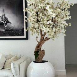 36″ Casa Moderna made of blue acrylic plates with white phalaenopsis orchids. sandblasted grape wood. and our illusion water. The stunning sight of a now white orchids in full bloom is nothing less than breathtaking. Their huge. curving petals; rows of gorgeous blooms march along our Casa Moderna blue acrylic plate planter. This blue translucent modern glass planter features 90 degree angles and a modern linear design. The sight of a massed display of white vanda orchids is so arresting that we have paired it with natural sandblasted grape wood to achieve a beautiful and organic contrast.