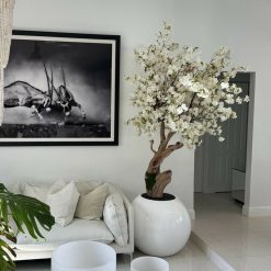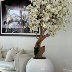 Cherry blossoms are a symbolic flower of the spring. a time of renewal. and the fleeting nature of life. Anchored in our white 30″ globe vase which showcases a basic spherical shape. only with a modern twist. The full globe shape is the quintessential mix of traditional and contemporary styles as the round planters easily compliment any space around the home. garden or office. Its size and shape provide a perfect canvas for a our large white cherry blossom tree. Each tree is a one of a kind. flowers are placed by hand by our skilled artisans onto large wood trunks of California mountain wood. This bouquet of elegant white cherry adds a fresh and stylish touch to any room.