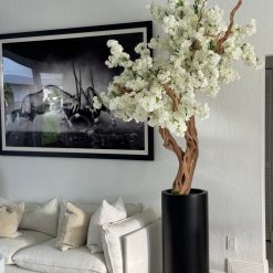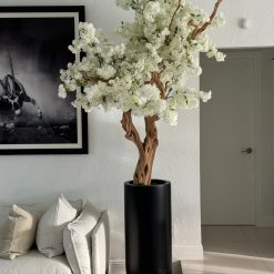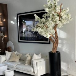 Cherry blossoms are a symbolic flower of the spring. a time of renewal. and the fleeting nature of life. Anchored in our St. Tropez matte black planter. this chic design adds a modern twist to any decor. The sleek planter easily compliment any space around the home or office. Its size and shape provide a perfect canvas for a our large white cherry blossom tree. Each tree is a one of a kind. flowers are placed by hand by our skilled artisans onto large wood trunks of California mountain wood. This bouquet of lush elegant white cherry adds a fresh and stylish touch to any room.